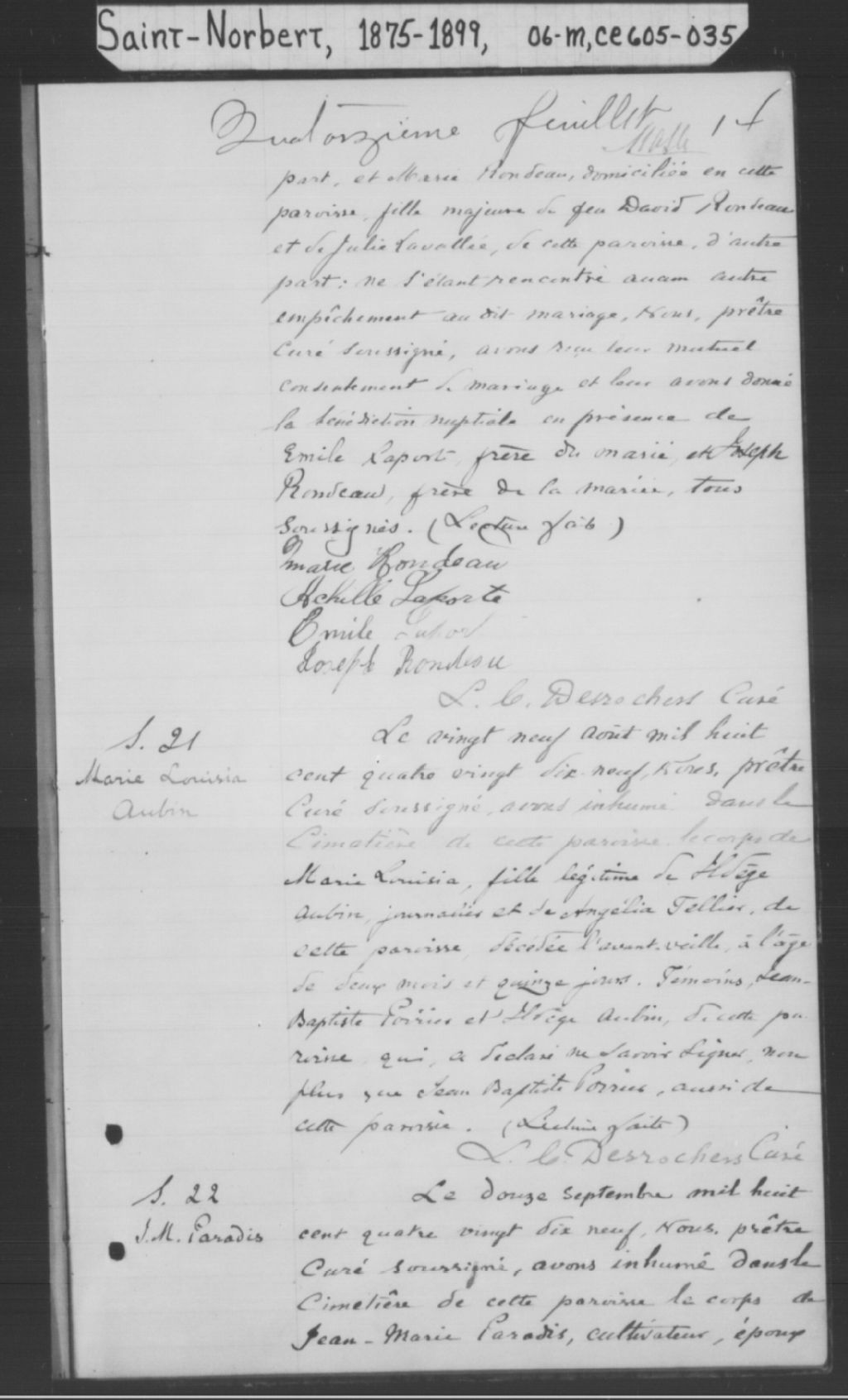 Saint-Norbert, 1847-1921, Archives nationales à Montréal, Fonds Cour supérieure. District judiciaire de Joliette. État civil, (06M,CE605,S35).