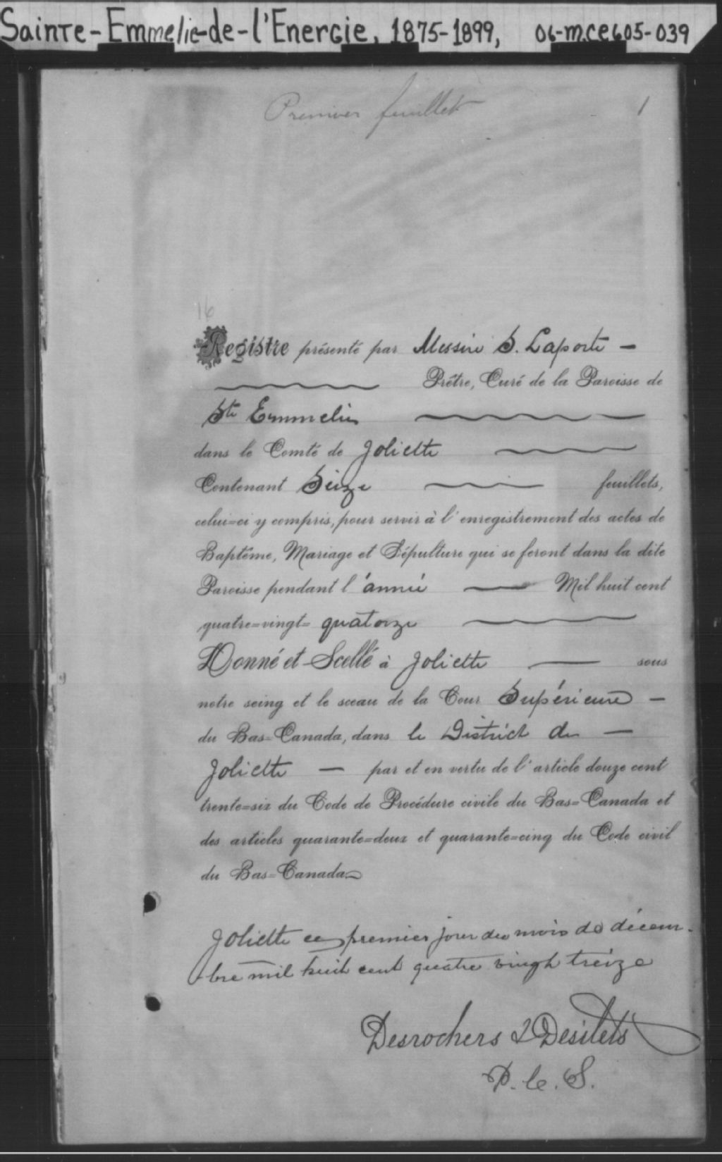 Sainte-Emélie-de-l'Énergie, 1870-1921, Archives nationales à Montréal, Fonds Cour supérieure. District judiciaire de Joliette. État civil, (06M,CE605,S39).