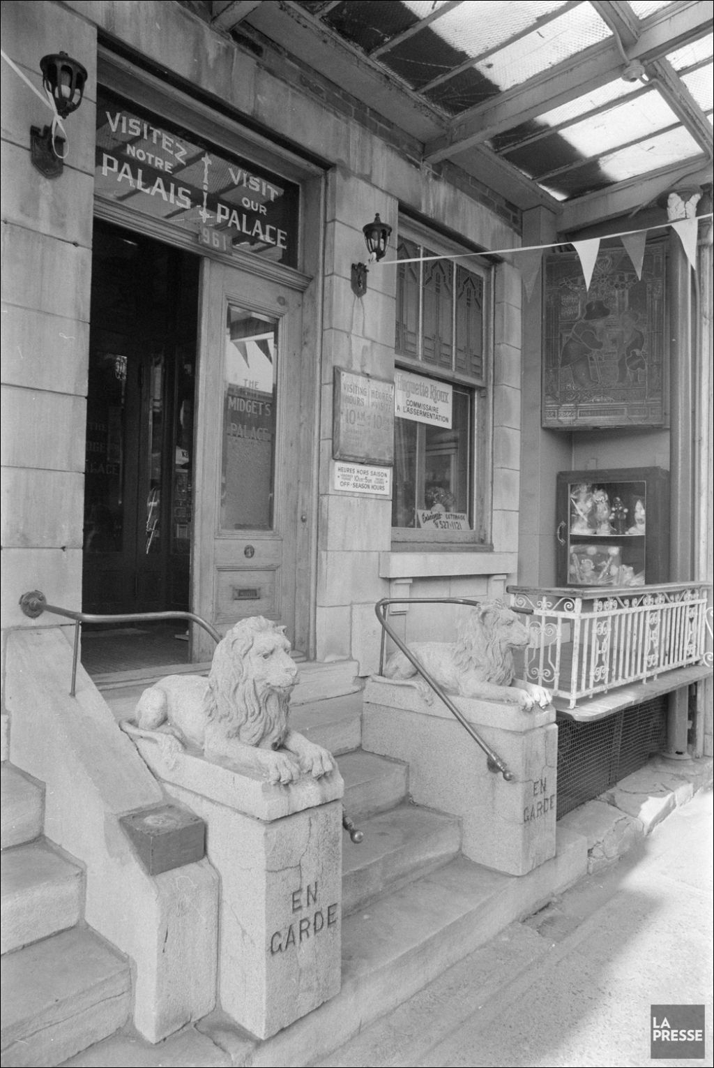 - Le dossier porte sur un reportage intitulé "Visite du Palais de nains" situé au 961, rue Rachel. Les documents montrent notamment l'entrée bordée de deux lions en ciment, une affiche indiquant les heures d'ouverture du Palais, ainsi que deux personnes de petite taille à l'intérieur