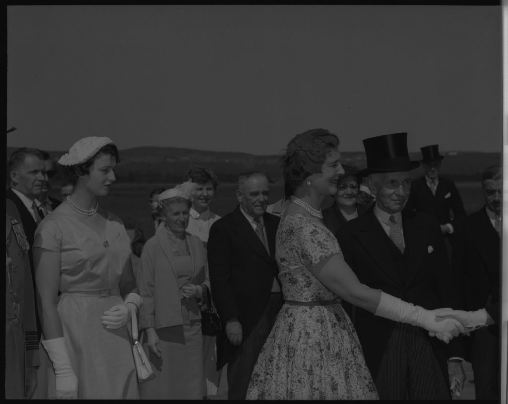 Présentation des notables à l'aéroport de Québec lors de l'arrivée de la duchesse de Kent et de sa fille. L''honorable Onésime Gagnon et son épouseentre les deux princesses