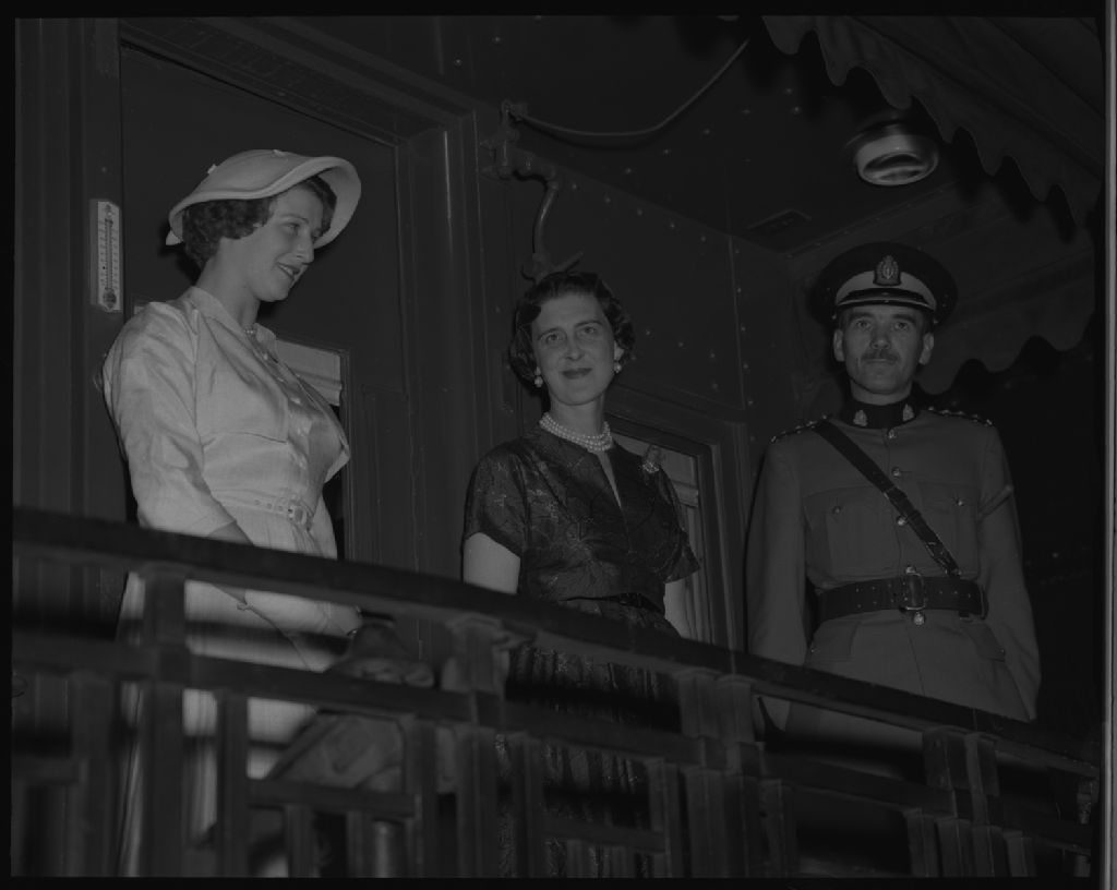 La duchesse de Kent et sa fille Alexandra sur la passerelle arrière du train au moment de leur départ de Québec. L'Officier Ashley de la gendarmerie royale est à leur côté. Gare du palais, Québec