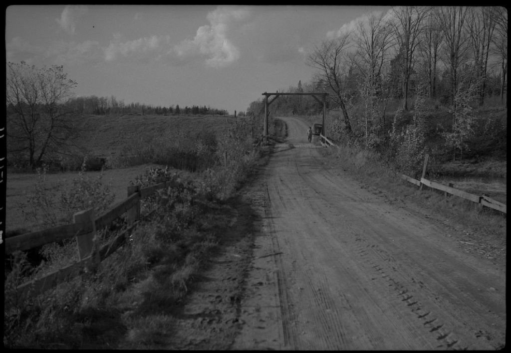 Vue des approches du pont Alain traversant la rivière Boisclair, concession Saint-Charles Sud à Saint-Édouard-de-Lotbinière, 1954, Archives nationales à Québec, Fonds Ministère de la Culture et des Communications, (03Q,E6,S7,SS1,D6,P761-54H), Jacques Vaillancourt.