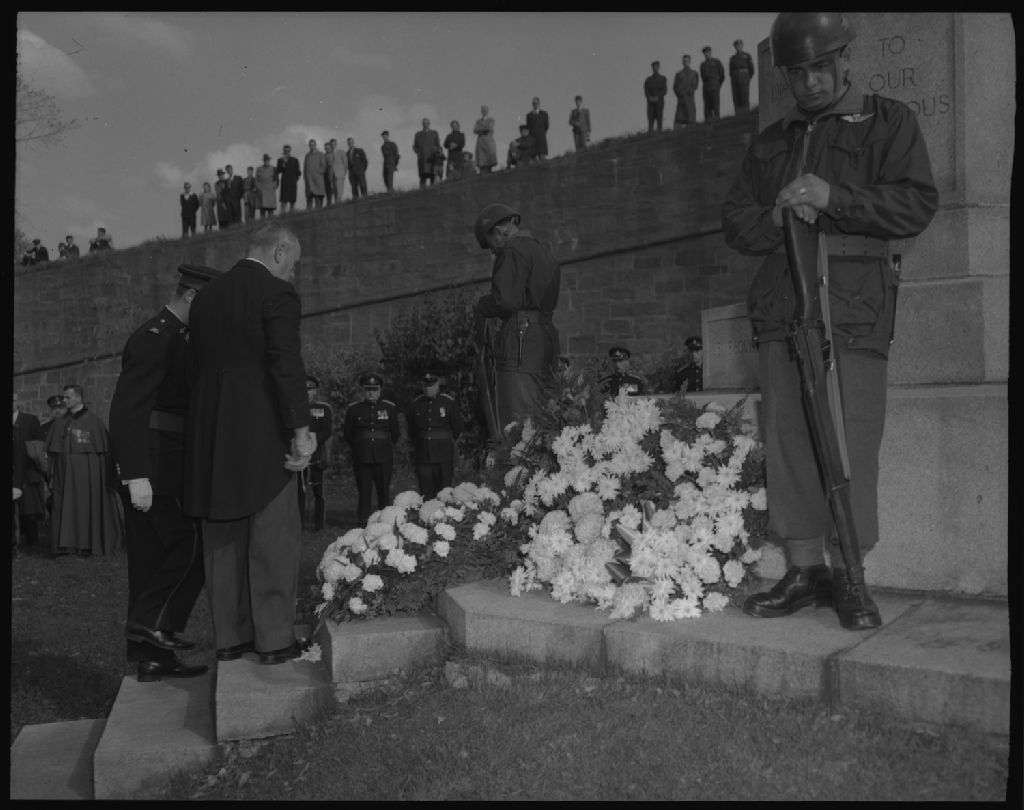 Différentes personnalités déposant des couronnes à la Croix du sacrifice lors de la cérémonie du 40ième anniversaire du 22ième régiment. Québec