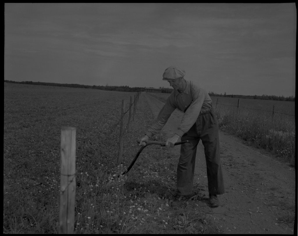 Cyprien Vezeau fauche le chemin de ferme à Sainte-Claire-de-Colombourg