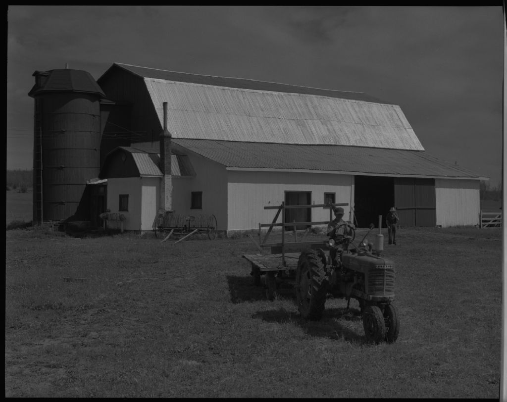 Grange-étable chez Henri Trudel, Clerval, 1954, Archives nationales à Québec, Fonds Ministère de la Culture et des Communications, (03Q,E6,S7,SS1,D6,P1079-54H), Omer Beaudoin.