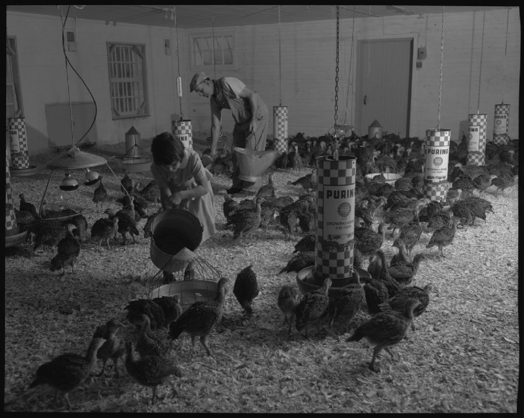 Dindonneaux à l'intérieur chez Jos. Trudel à Saint-Irénée