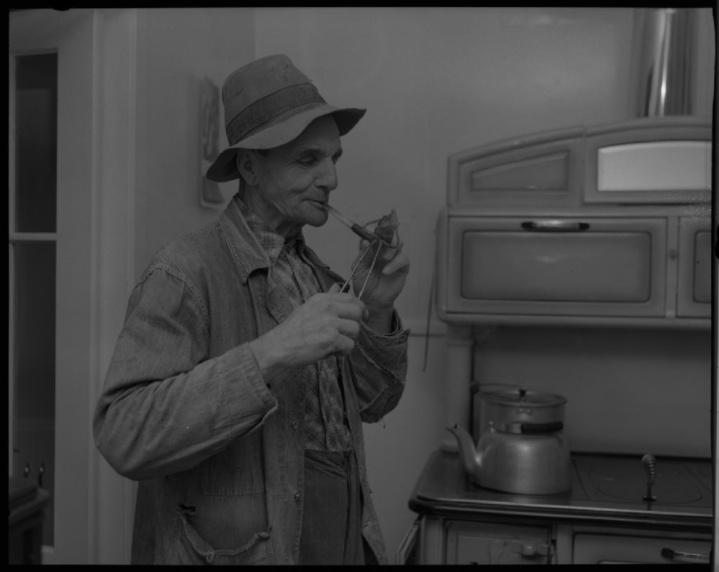Pitre Gagnon allume sa pipe à un tison de poêle à Métabetchouan