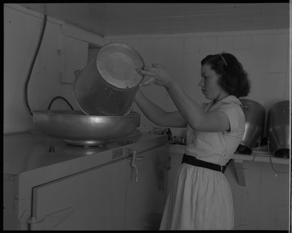 Marie-Reine Ross (fille d'Alphonse Ross) dans la laiterie très moderne à Sainte-Flavie