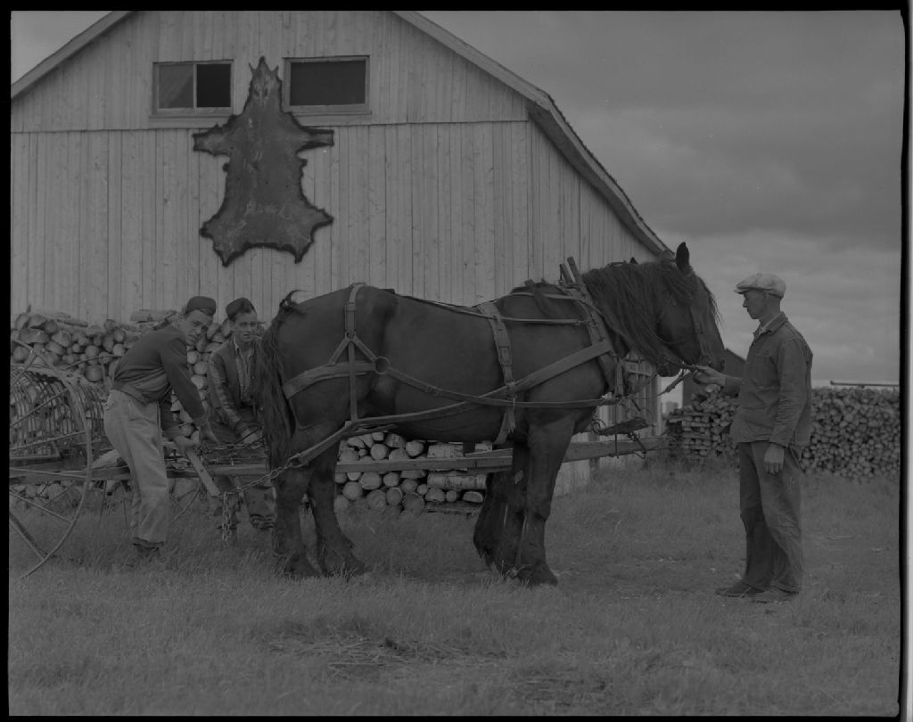 On atelle le rateau chez Charles Carignan à Harricana-Ouest, 1954, Archives nationales à Québec, Fonds Ministère de la Culture et des Communications, (03Q,E6,S7,SS1,D6,P1366-54H), Omer Beaudoin.