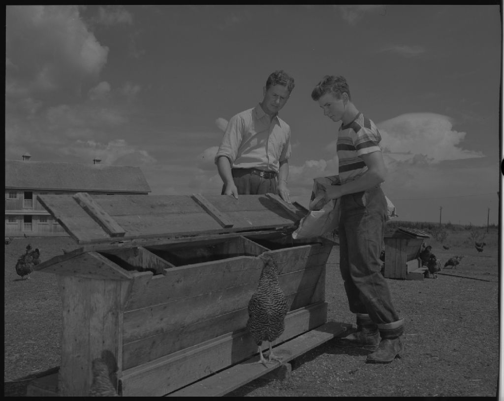 Jean-Marie et Martin Trudel emplissent les trémies à la Ferme Trudel Inc. à Hauterive, 1954, Archives nationales à Québec, Fonds Ministère de la Culture et des Communications, (03Q,E6,S7,SS1,D6,P1392-54H), Omer Beaudoin.
