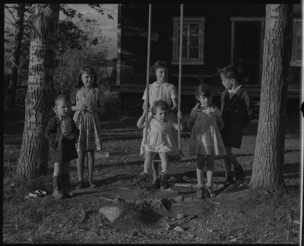 Enfants sur la balançoire chez Adolphe Larouche à La Décharge, comté de Chicoutimi, 1954, Archives nationales à Québec, Fonds Ministère de la Culture et des Communications, (03Q,E6,S7,SS1,D6,P1403-54H), Omer Beaudoin.