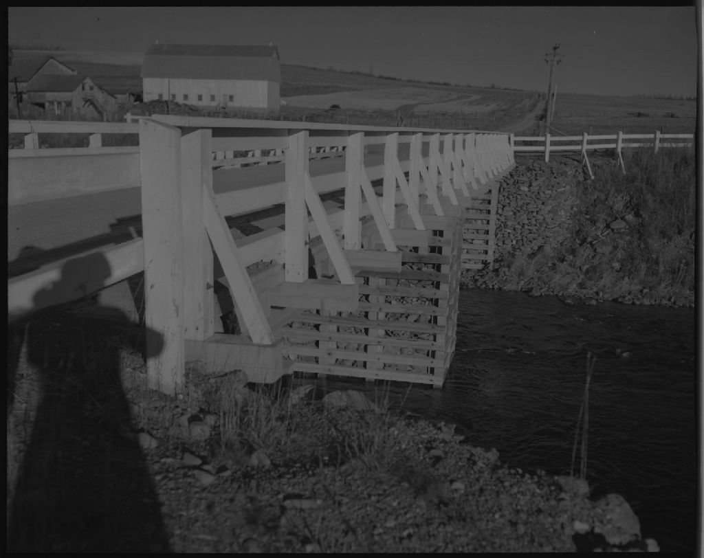 Pont sur la rivière Humqui à Saint-Léon-le-Grand, 1954, Archives nationales à Québec, Fonds Ministère de la Culture et des Communications, (03Q,E6,S7,SS1,D2363,P1737-54H), Paul Carpentier.