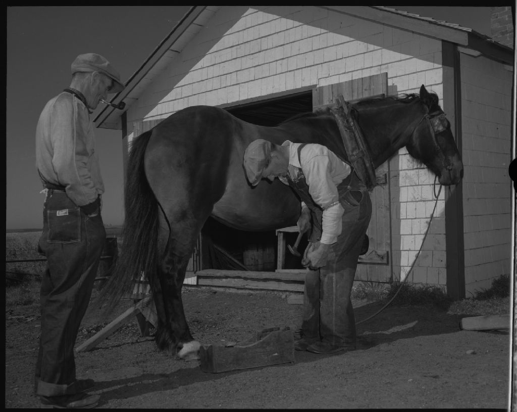 Azade Arsenault ferre un cheval à Portage-du-Cap, Îles-de-la-Madeleine, 1954, Archives nationales à Québec, Fonds Ministère de la Culture et des Communications, (03Q,E6,S7,SS1,D1063-54H,P1063-54H), O. Beaudoin.