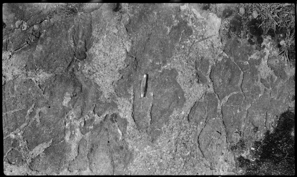 Pyroxenite gris foncé avec intrusions de pegmatite blanche, canton Aldfield, comtés de Pontiac et de Gatineau, 1954, Archives nationales à Québec, Fonds Ministère de la Culture et des Communications, (03Q,E6,S7,SS1,D2100-54H,P2100-54H), D.R. Baker.