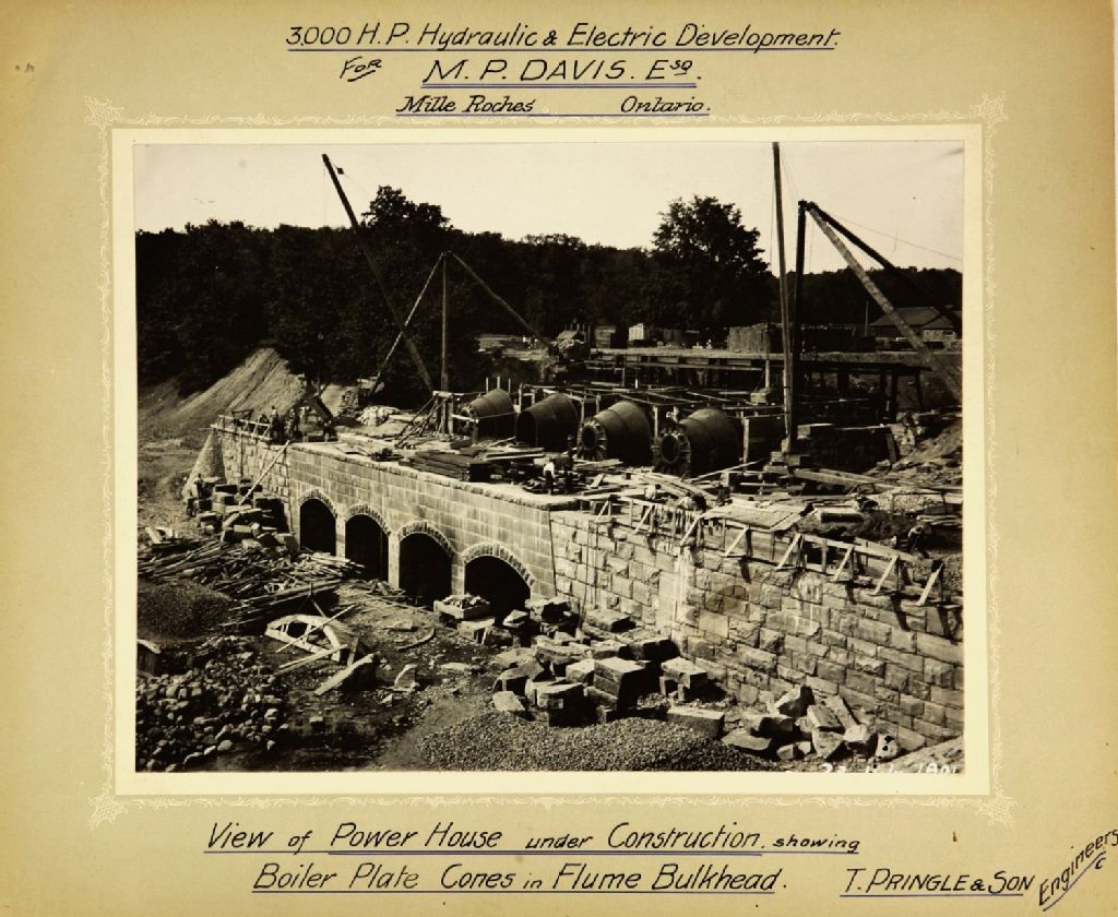 Photographie prise lors de la construction d'une centrale électrique pour M. P. Davis à Mille Roches en Ontario.