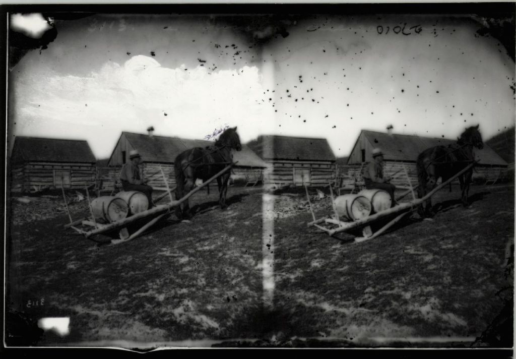 Ce dossier se compose de deux négatifs sur verre en stéréogramme. D'une part, on y voit un homme assis sur un des deux barils transportés sur un traîneau de bois, en été, tiré par un cheval devant des bâtiments de ferme en pièces de bois équarri et en bois ronds. D'autre part, on y voit un colon, devant sa maison en pièces sur pièces, posant debout avec un attelage de boeufs