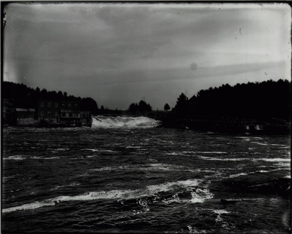 Usine de William Taylor Gibbs et de Walter Wiliams près d'une chute sur la rivière du Lièvre ; à droite, le château d'eau de la ville de Buckingham