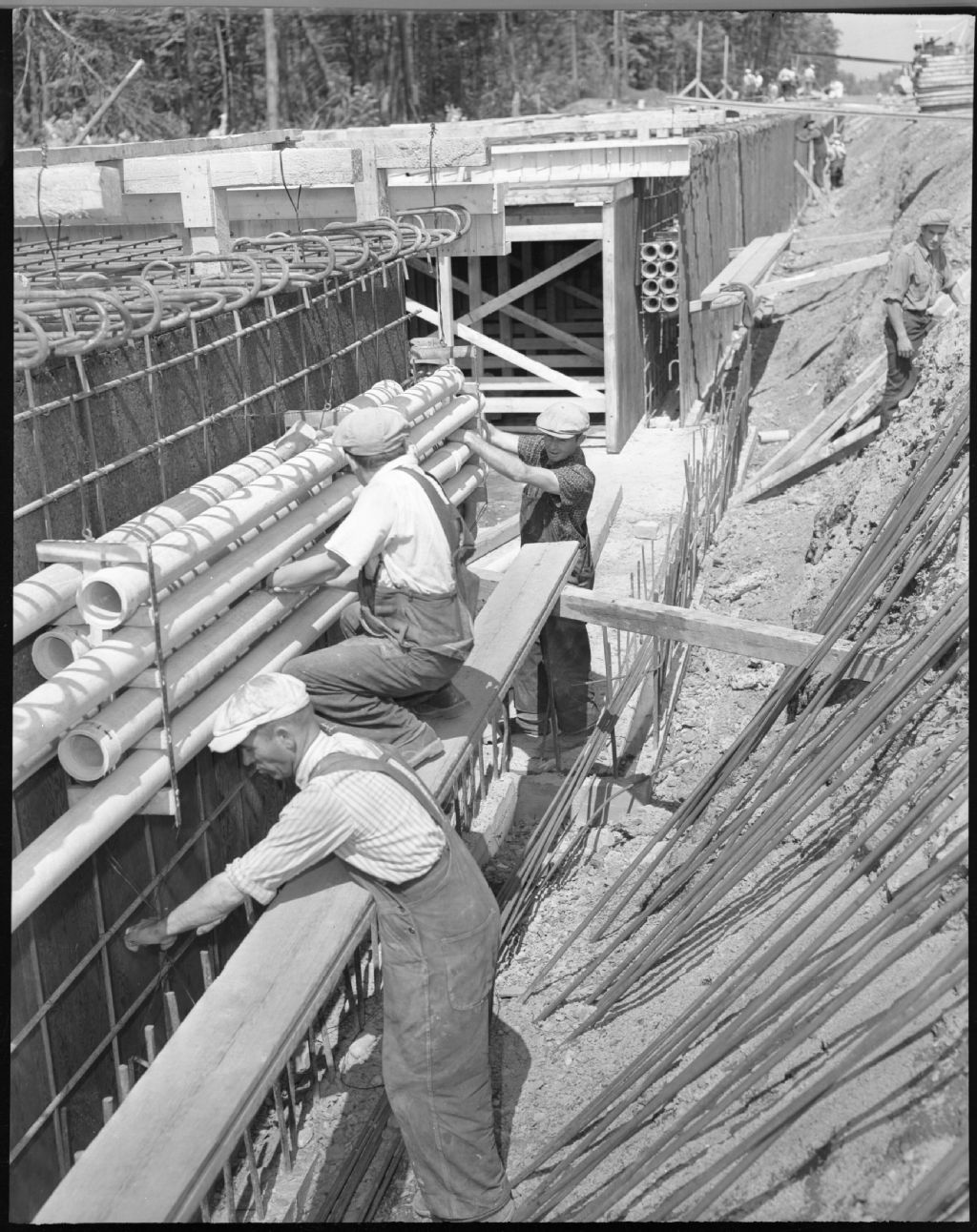 [Galerie souterraine en construction], 1950, Archives nationales à Québec, Fonds Ministère de la Culture et des Communications, (03Q,E6,S7,SS1,D2591,P289-50-3D), Georges A. Driscoll.
