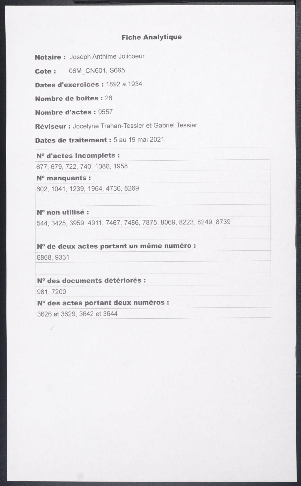 J.-Anthime-D. Jolicoeur, 1892-1934, Archives nationales à Montréal, Fonds Cour supérieure. District judiciaire de Montréal. Greffes de notaires, (06M,CN601,S665).
