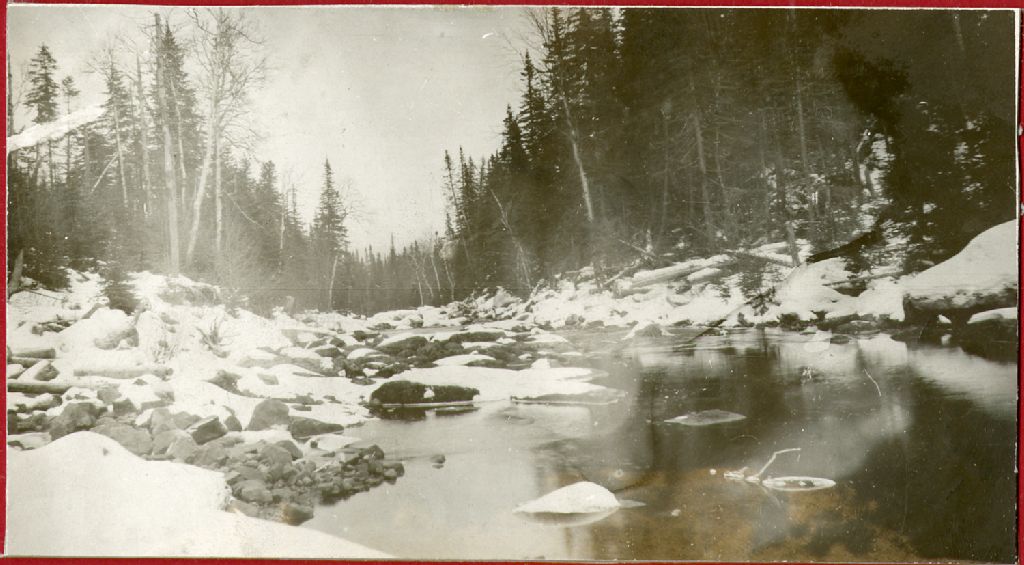 Rivière Brûlé - Emplacement du barrage projeté au lac Brûlé, vue aval, 1917, Archives nationales à Québec, Fonds Ministère de l'Environnement et de la Lutte contre les changements climatiques, (03Q,E57,S44,SS1,D142,PZ18), Photographe non identifié.