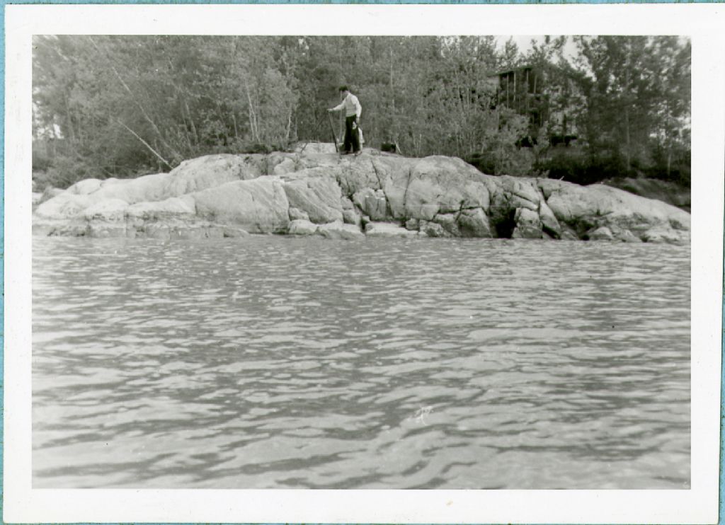 Lac Macamic (Lot 20, rang IV) - Site pour échelle automatique chez Jos. Lépine - Hommes sur un rocher avec un théodolite, 11 juin 1948, Archives nationales à Québec, Fonds Ministère de l'Environnement et de la Lutte contre les changements climatiques, (03Q,E57,S44,SS1,D260,PZ124), Photographe non identifié.