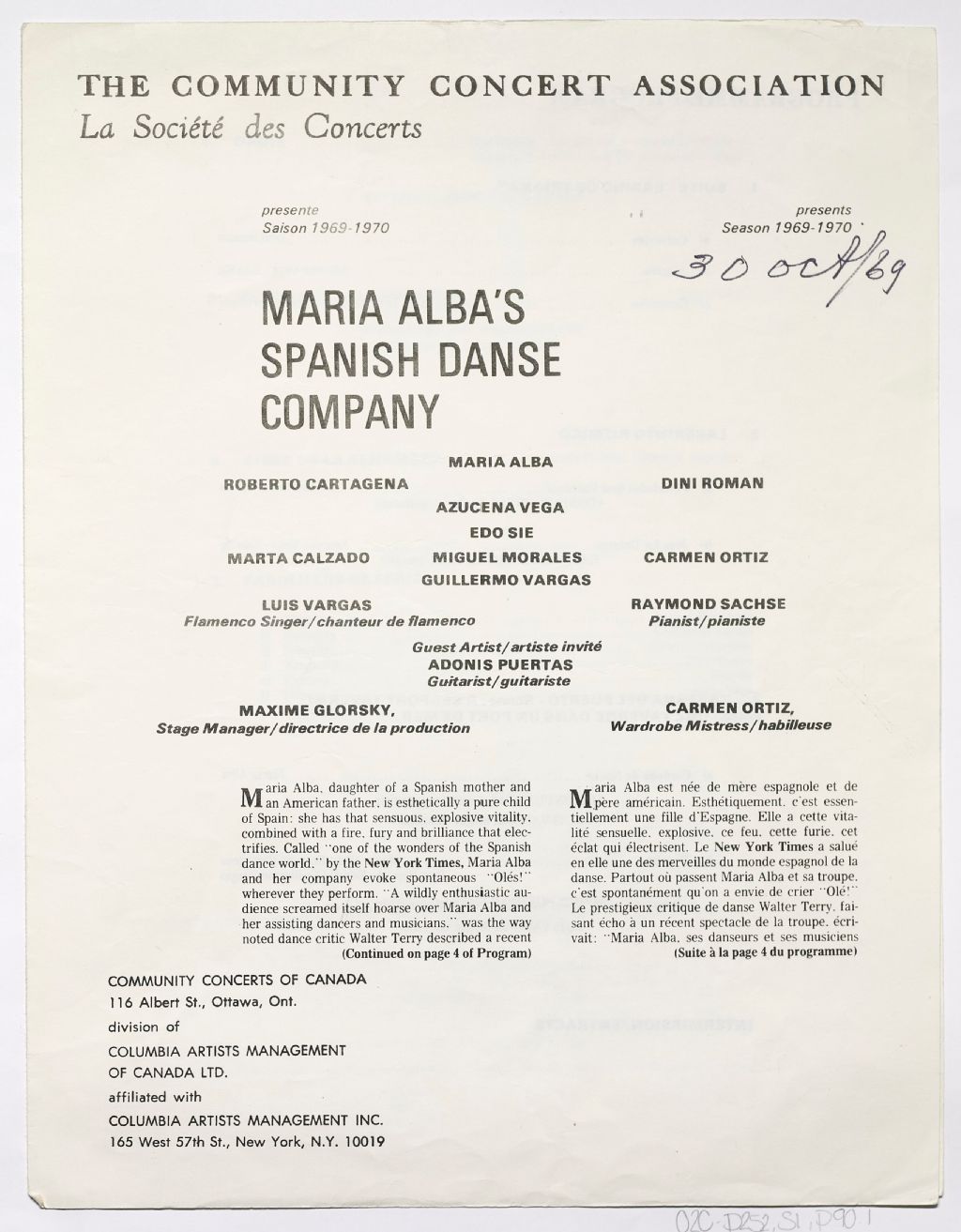 Programme de la Compagnie de danse espagnole de Maria Alba, 1969-10-30, Archives nationales à Saguenay, Gabrielle Gaudreault, (02C,P252,D1,P90.1).