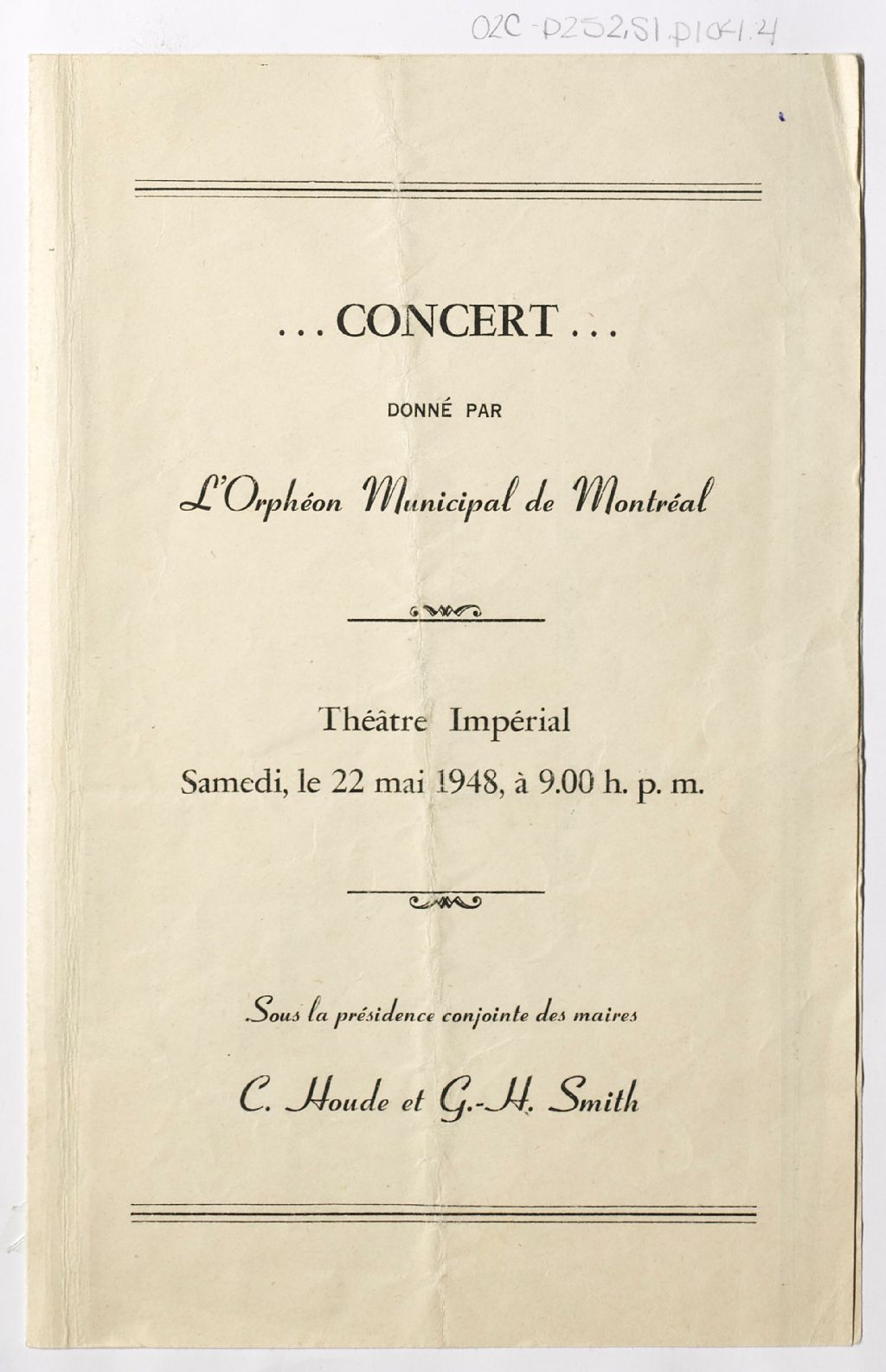 Programme du concert de l'Orphéon municipal de Montréal, 1948-05-22, Archives nationales à Saguenay, Gabrielle Gaudreault, (02C,P252,D1,P104.4).