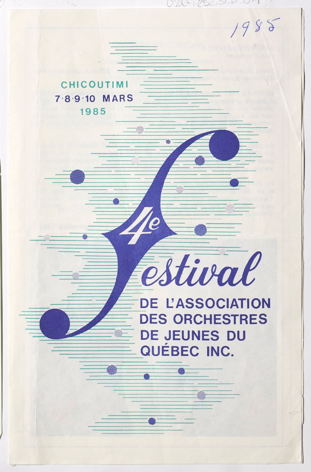 Programme du Festival de l'Association des orchestres de jeunes du Québec inc, 1985-03-07, Archives nationales à Saguenay, Gabrielle Gaudreault, (02C,P252,D1,P130.4).