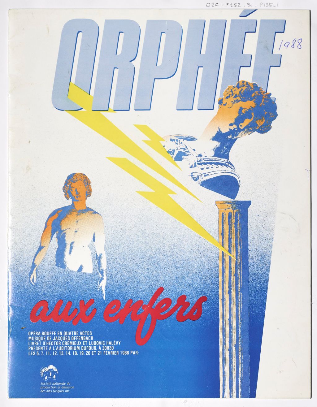 Programme de l'opéra Orphée aux enfers, présenté par la Société nationale de production et diffusion des arts lyriques Inc., Auditorium Dufour, février 1988