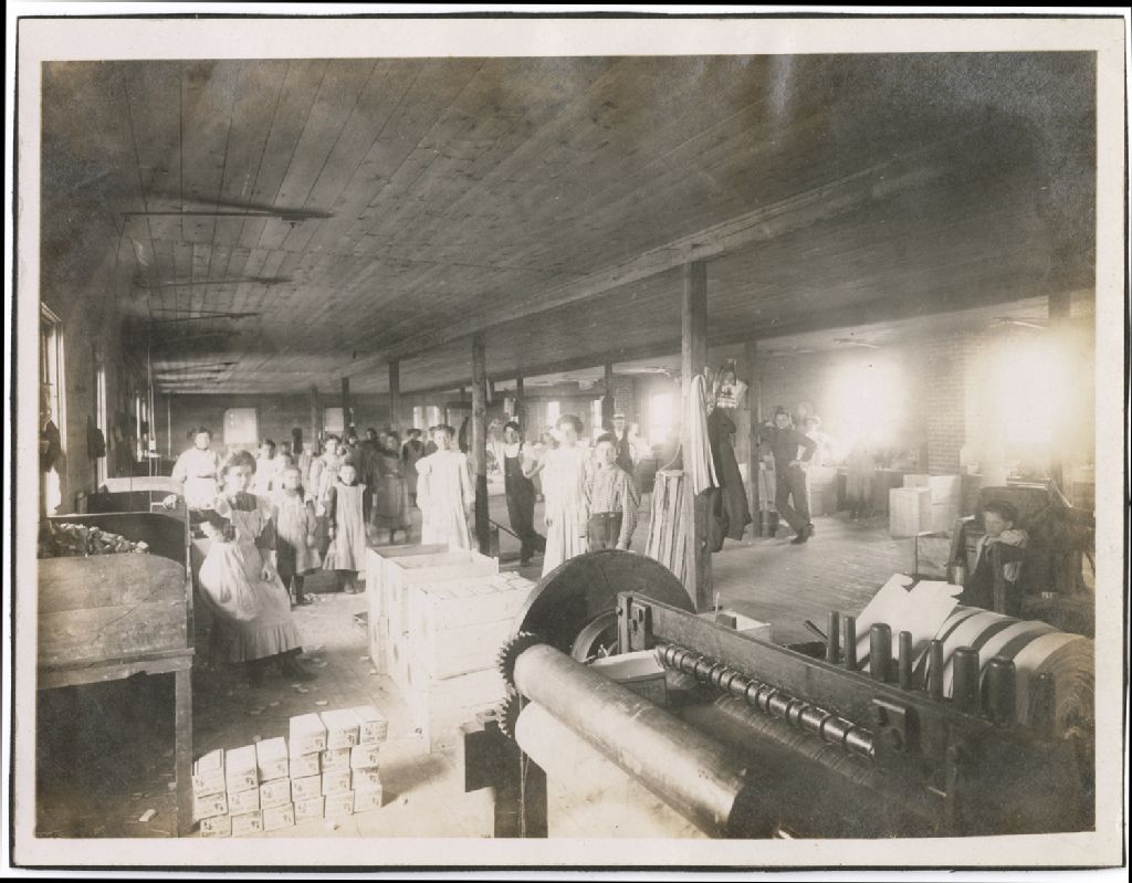 Compagnie manufacturière d'allumettes de Saint-Casimir, vue de l’intérieur. On y voit des ouvrières, des ouvriers et des enfants.