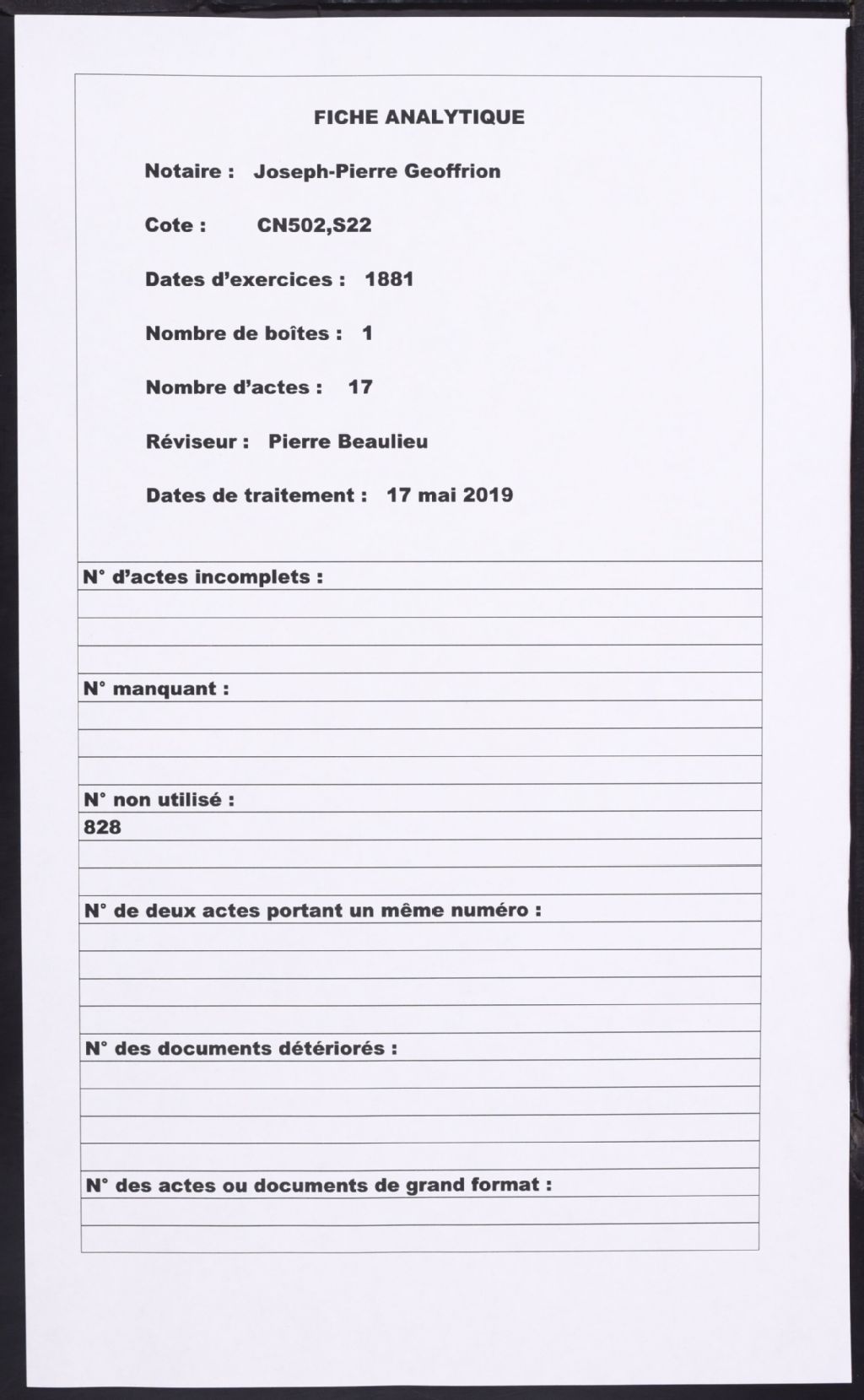 Joseph-Pierre Geoffrion, 1881, Archives nationales à Sherbrooke, Fonds Cour supérieure. District judiciaire de Bedford. Greffes de notaires, (05S,CN502,S22).