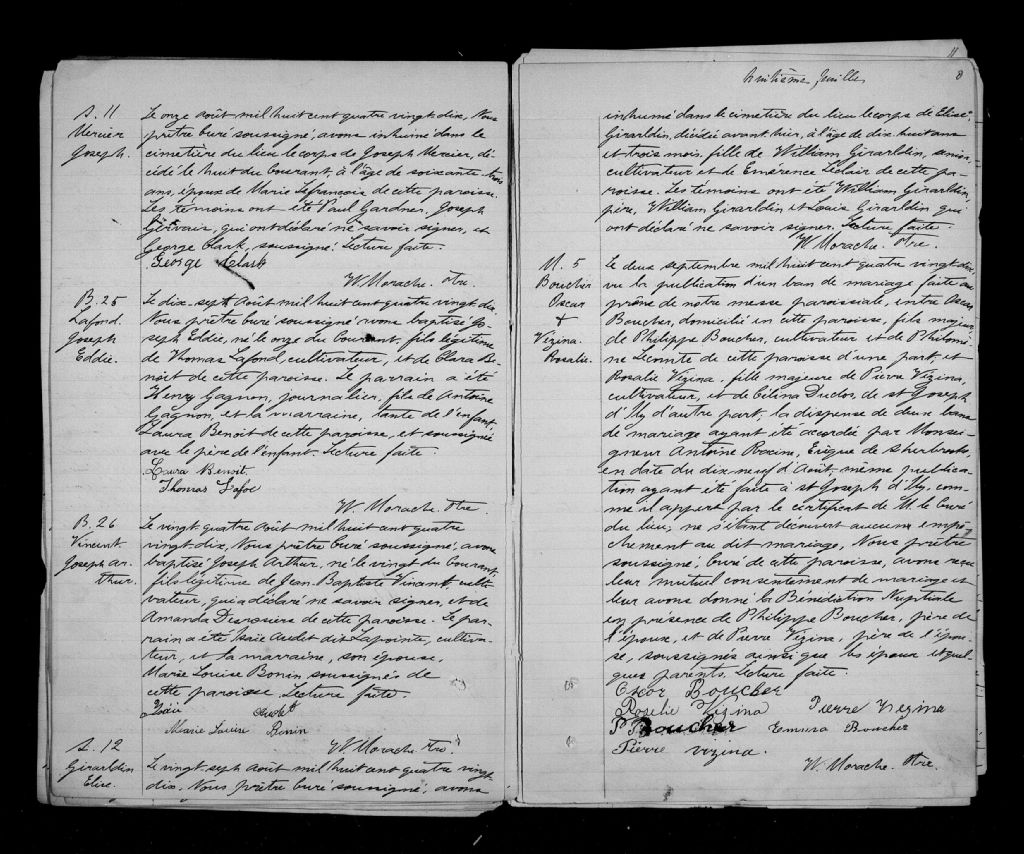 - Cette série regroupe les registres originaux de l'état civil, lesquels contiennent les enregistrements de baptêmes, de mariages et de sépultures consignés par le curé ou son représentant desservant la communauté de confession catholique de la paroisse Sainte-Edwidge, dans le canton de Clifton. On retrouve également, en règle générale, un index nominatif à la fin de chaque registre.Les registres de 1874 et 1875 comprennent aussi les entrées pour la paroisse Saint-Magloire, créée mais non érigée canoniquement dans le hameau Malvina. Ce secteur fait partie de l¿actuelle paroisse Saint-Malo (CE501,S107).Pour 1862 à 1873, voir Saint-Thomas-d'Aquin de Compton (CE501,S26)