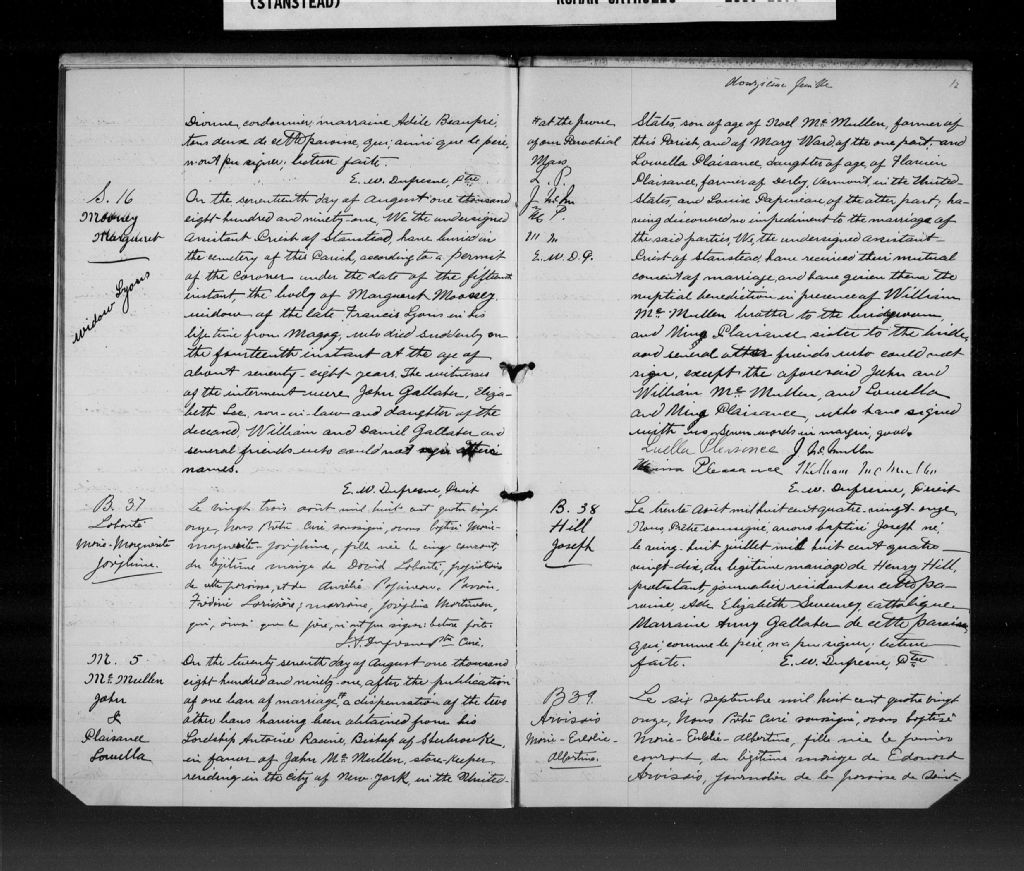 Cette série regroupe les registres originaux de l'état civil, lesquels contiennent les enregistrements de baptêmes, de mariages et de sépultures consignés par le curé ou son représentant desservant la communauté de confession catholique de la paroisse Sacré-C¿ur-de-Jésus de Stanstead. On retrouve également, en règle générale, un index nominatif à la fin de chaque registre.Les registres comprennent aussi des actes des catholiques de plusieurs villes des États du Vermont, du Massachusetts et du New-Hampshire. Parmi les actes se trouvent notamment plusieurs mariages de confessions religieuses mixtes célébrés avec la permission des autorités religieuses.