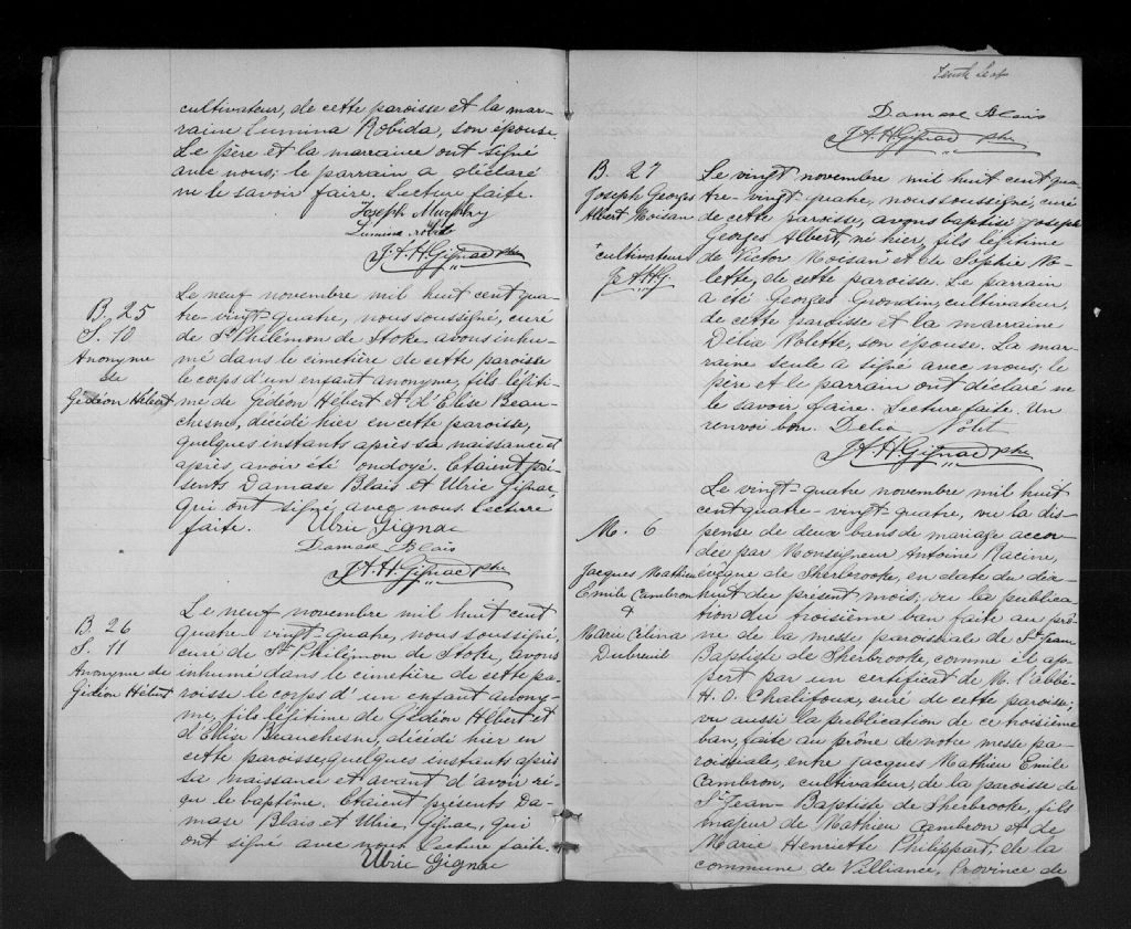 - Cette série regroupe les registres originaux de l'état civil, lesquels contiennent les enregistrements de baptêmes, de mariages et de sépultures consignés par le curé ou son représentant desservant la communauté de confession catholique de la paroisse Saint-Philémon de Stoke. On retrouve également, en règle générale, un index nominatif à la fin de chaque registre