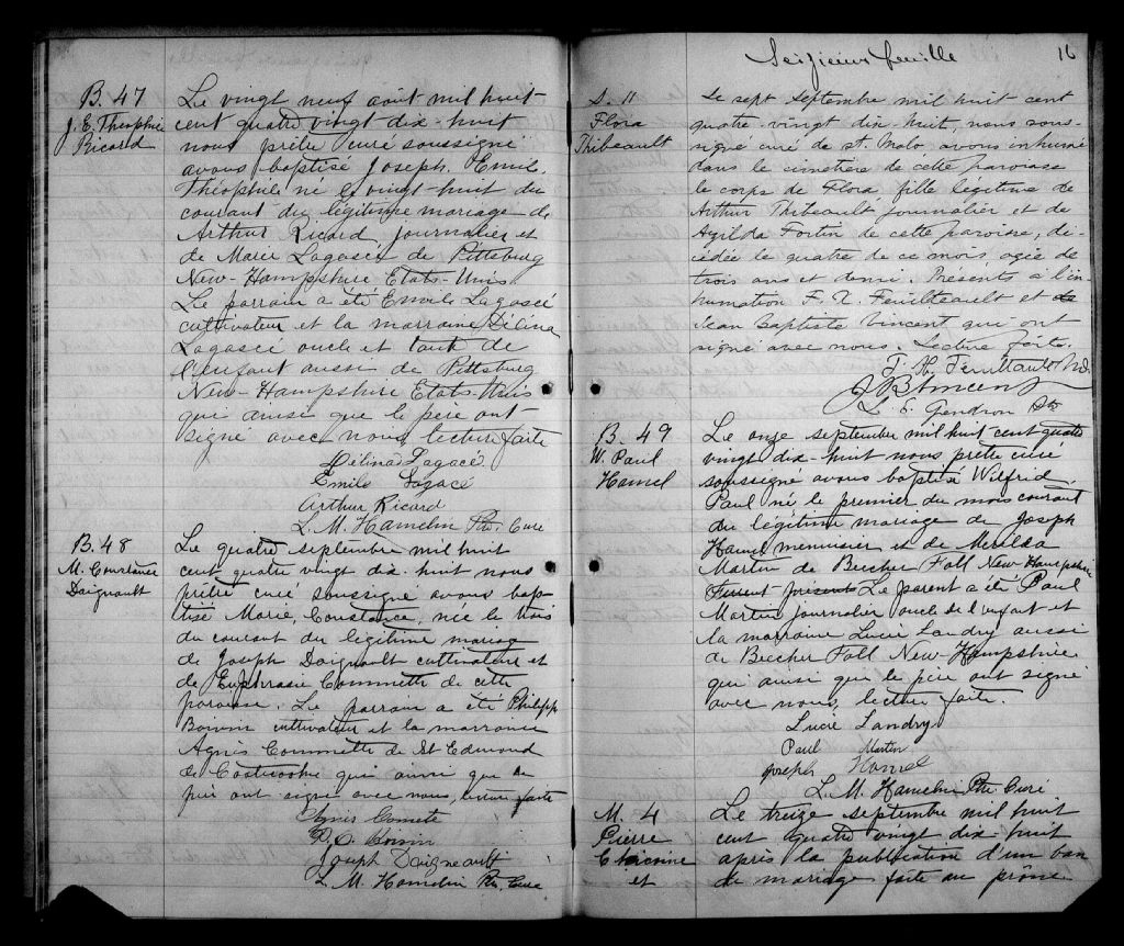 - Cette série regroupe les registres originaux de l'état civil, lesquels contiennent les enregistrements de baptêmes, de mariages et de sépultures consignés par le curé ou son représentant desservant la communauté de confession catholique de la paroisse Saint-Venant. On retrouve également, en règle générale, un index nominatif à la fin de chaque registre.Les registres de 1865 à 1883 comprennent aussi les entrées de Saint-Malo (CE501,S107); celui de 1915 comprend des entrées de Beecher Falls, au Vermont.Pour 1864, voir Saint-Thomas-d¿Aquin de Compton (CE501,S26)