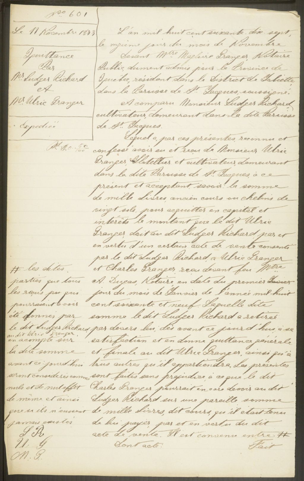 - Les minutes du notaire Magloire Granger reflètent les activités de la population de la ville de Joliette où il a commencé sa pratique en 1867-1868, de Saint-Ambroise-de-Kildare, où il a pratiqué de 1868 à 1871, puis ensuite de Saint-Jacques-de-l'Achigan, où il a terminé sa carrière.Source : Jean-Marie Laliberté. Index des lieux de résidence et de pratique des commis, des garde-notes, des greffiers, des tabellions, autres et des notaires, 1621-1991 ainsi que les lieux de dépôt de leurs minutiers avec leurs cotes aux A.N.Q. Montréal : J.-M. Laliberté, 1991