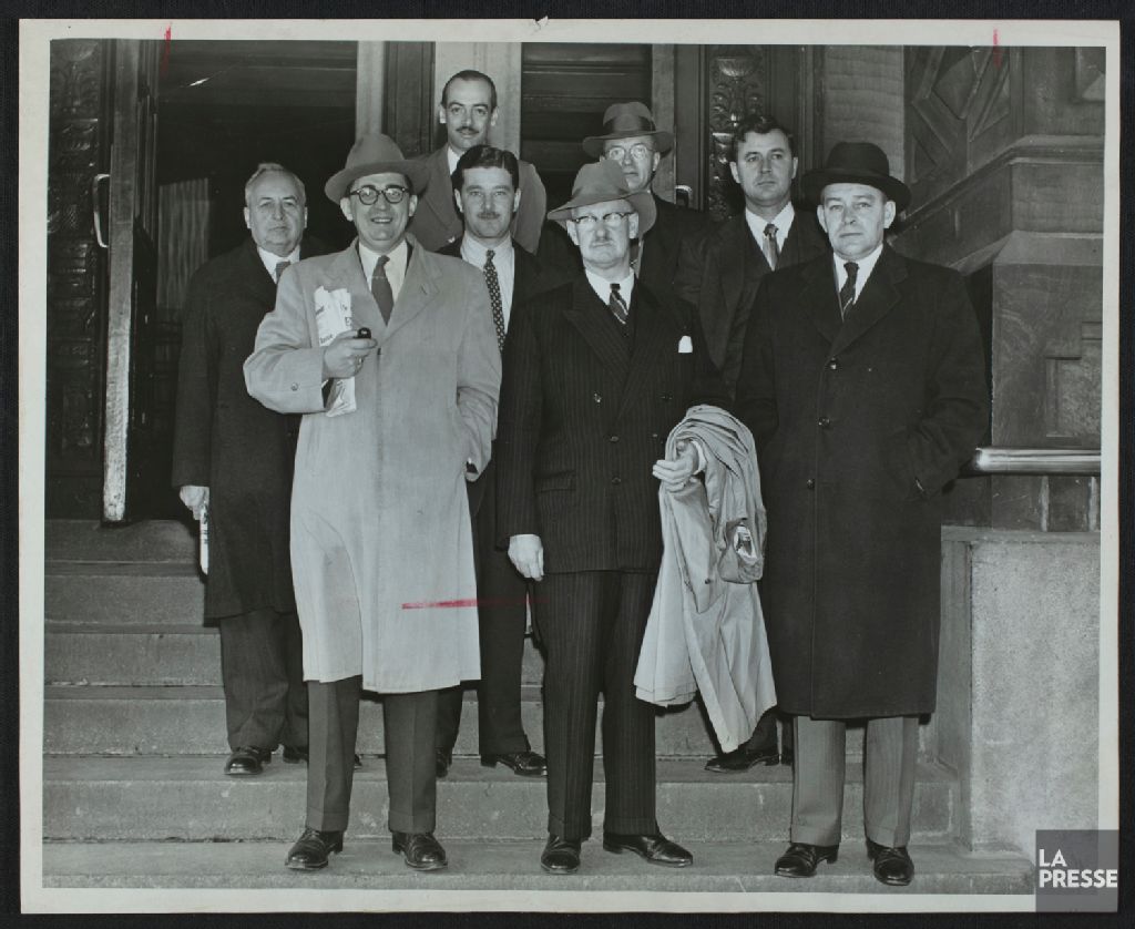 - La photographie illustre notamment l¿avocat Paul Gérin-Lajoie posant officiellement, en vue de l'enquête sur l'acheminement de marchandises ou de passagers sur une courte distance