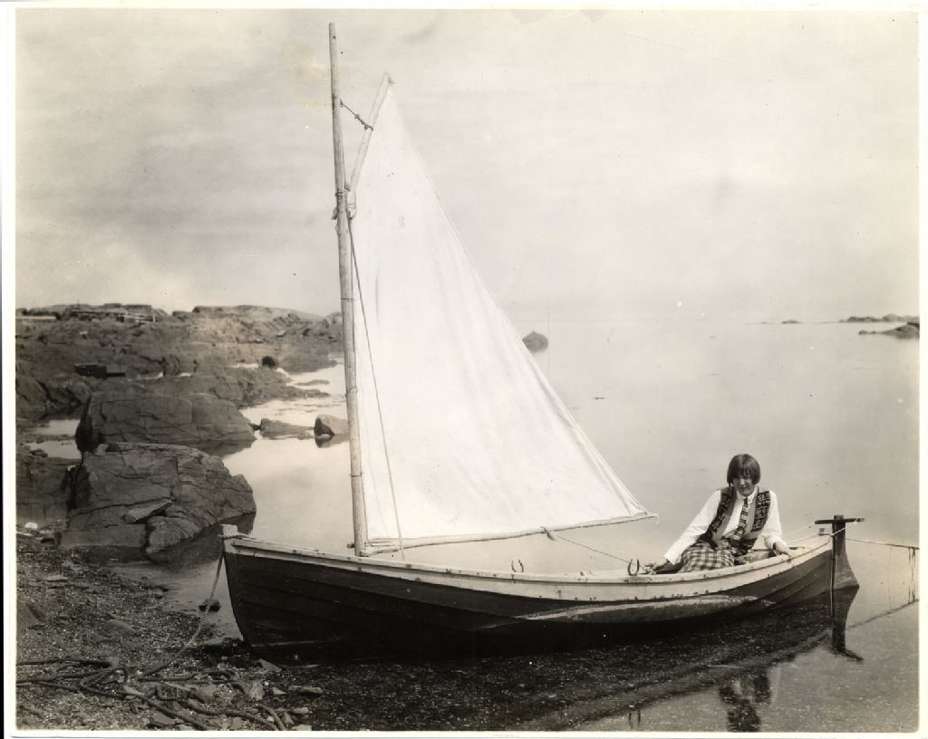 Une adepte de yachting à son embarcation, [Vers 1930], Archives nationales à Québec, Fonds L'Action catholique, (03Q,P428,S3,SS1,D41,P339), Chemin de fer national du Canada.