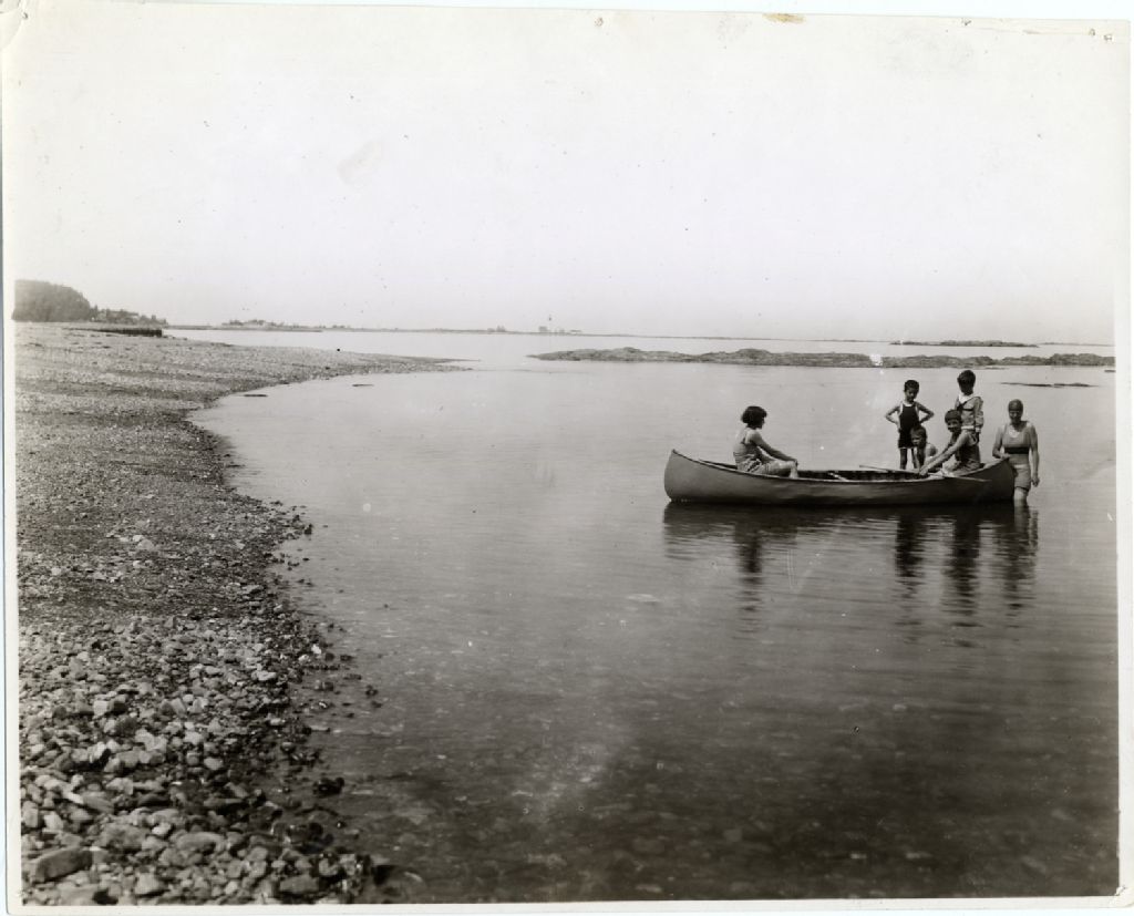 Des baigneurs et une embarcation à l'heure du bain, [Vers 1930], Archives nationales à Québec, Fonds L'Action catholique, (03Q,P428,S3,SS1,D41,P340), Canadien national.