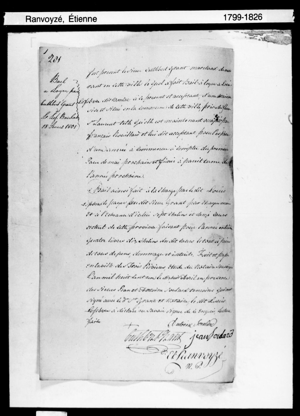- Cette série regroupe les minutes notariales du greffe de Étienne Ranvoyzé (4092 pièces numérotées) ainsi qu'un répertoire onomastique. Les minutes sont numérotées de 1 à 4092. À la fin des minutes, on retrouve huit (8) documents incomplets, sans date ou non signés. De 1799 à 1826, le notaire Ranvoyzé a exercé successivement à Saint Hyacinthe (du 30 avril 1799 au 26 août 1799) et à Trois-Rivières (du 22 novembre 1799 au 22 juillet 1826).Prises dans leur ensemble, les données colligées dans ces documents officiels à contenu administratif et légal peuvent constituer une source documentaire des plus révélatrices sur le mode et les conditions de vie de la population pendant cette période (métiers et professions mentionnés aux contrats, inventaires de biens, testaments), sur les classes sociales (mention de titres correspondant au rang social des parties concernées tels bourgeois, écuyer, etc), sur les moeurs et coutumes acceptées par la société et ses institutions (par le biais de déclarations, de jugement arbitral, d'injonctions, d'ordonnances, etc), et, dans une proportion moindre, sur la médecine d'époque et ses représentants.Enfin, la terminologie utilisée dans ces contrats notariés pourrait être avantageusement récupérée dans le cadre d'études portant sur l'évolution du langage administratif et légal, voire même sur l'évolution de la langue française