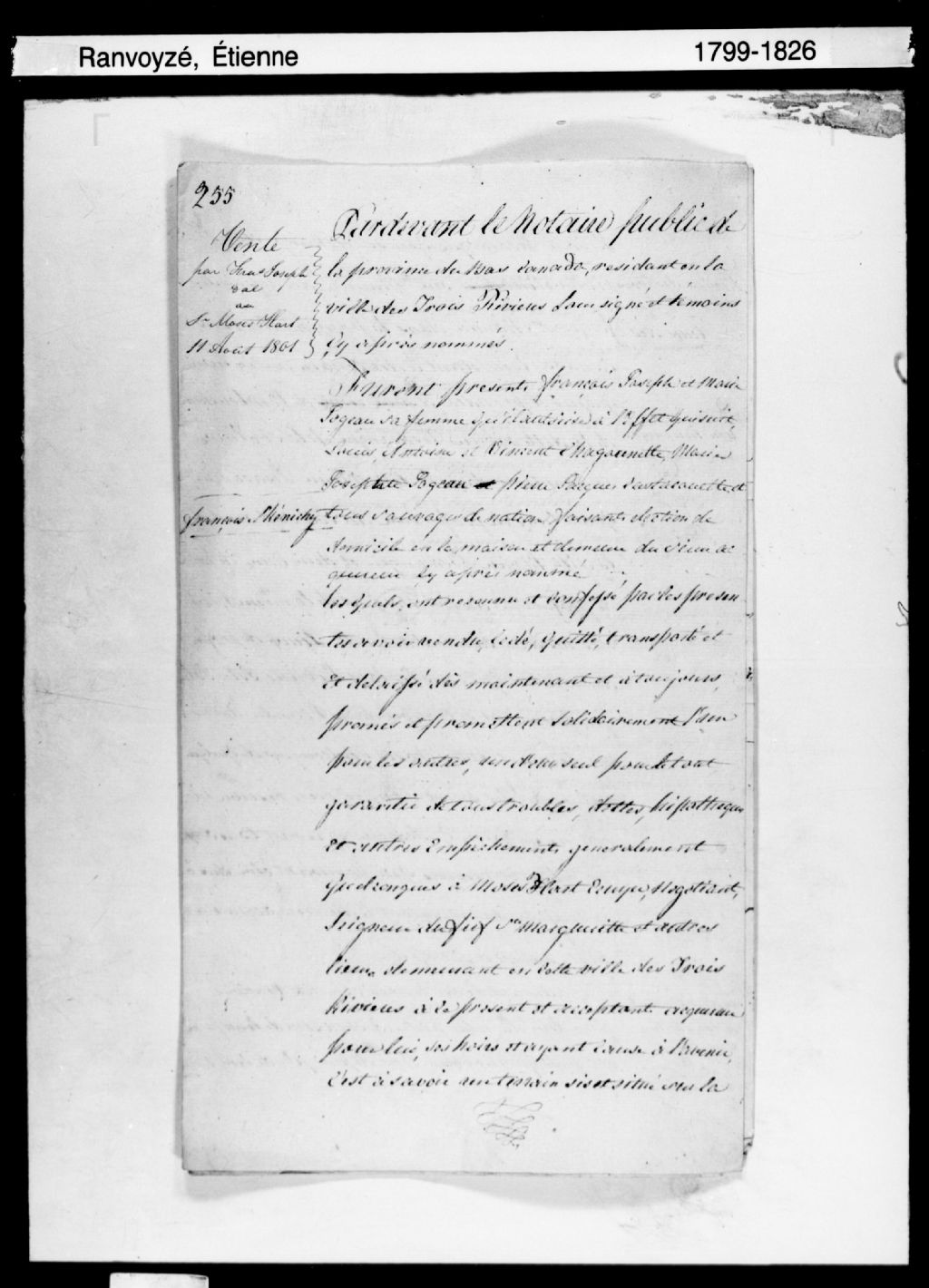 - Cette série regroupe les minutes notariales du greffe de Étienne Ranvoyzé (4092 pièces numérotées) ainsi qu'un répertoire onomastique. Les minutes sont numérotées de 1 à 4092. À la fin des minutes, on retrouve huit (8) documents incomplets, sans date ou non signés. De 1799 à 1826, le notaire Ranvoyzé a exercé successivement à Saint Hyacinthe (du 30 avril 1799 au 26 août 1799) et à Trois-Rivières (du 22 novembre 1799 au 22 juillet 1826).Prises dans leur ensemble, les données colligées dans ces documents officiels à contenu administratif et légal peuvent constituer une source documentaire des plus révélatrices sur le mode et les conditions de vie de la population pendant cette période (métiers et professions mentionnés aux contrats, inventaires de biens, testaments), sur les classes sociales (mention de titres correspondant au rang social des parties concernées tels bourgeois, écuyer, etc), sur les moeurs et coutumes acceptées par la société et ses institutions (par le biais de déclarations, de jugement arbitral, d'injonctions, d'ordonnances, etc), et, dans une proportion moindre, sur la médecine d'époque et ses représentants.Enfin, la terminologie utilisée dans ces contrats notariés pourrait être avantageusement récupérée dans le cadre d'études portant sur l'évolution du langage administratif et légal, voire même sur l'évolution de la langue française
