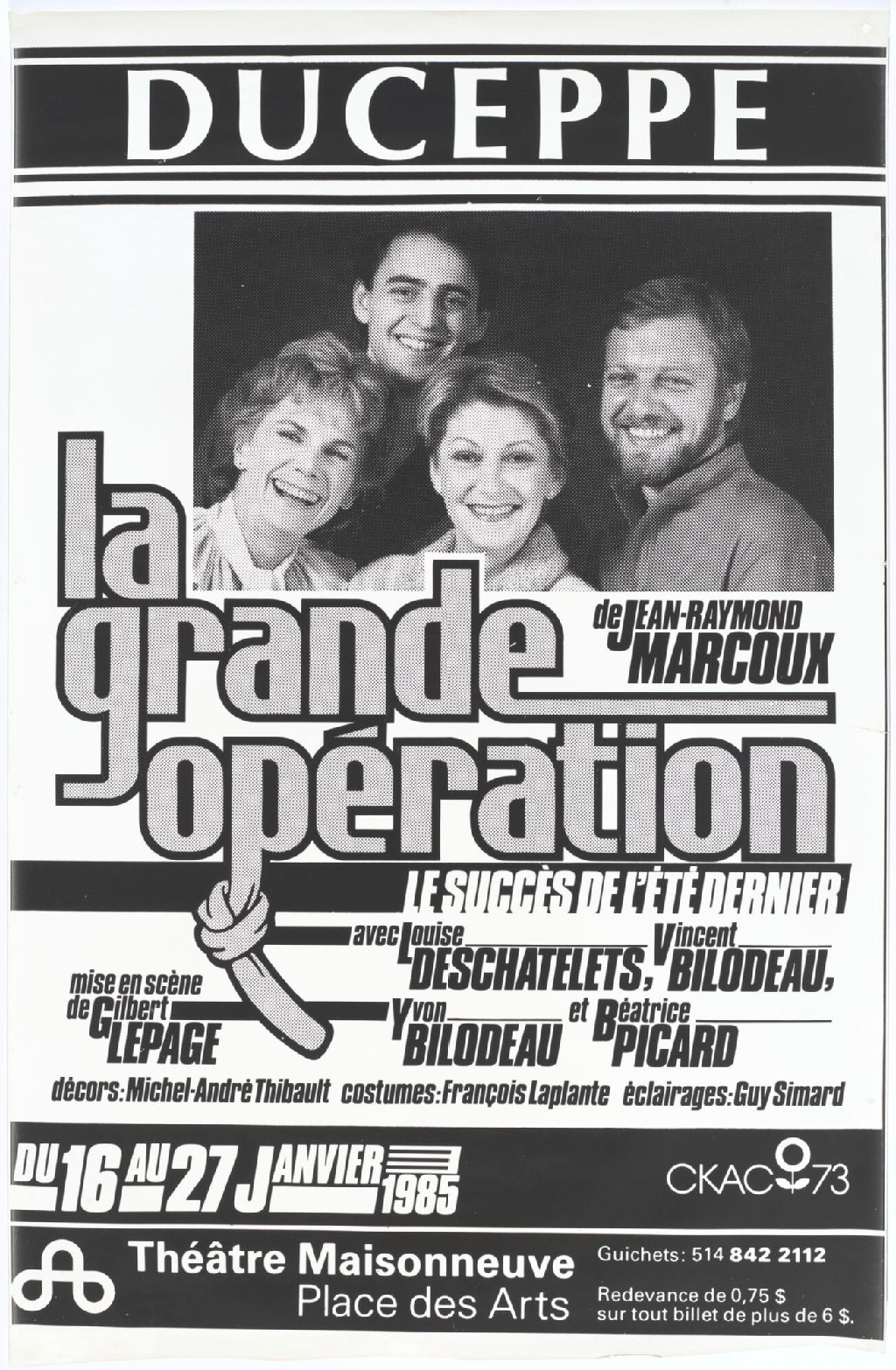La grande opération, de Jean-Raymond Marcoux : le succès de l'été dernier : avec Louise Deschâtelets, Vincent Bilodeau, Yvon Bilodeau et Béatrice Picard, mise en scène de Gilbert Lepage ...