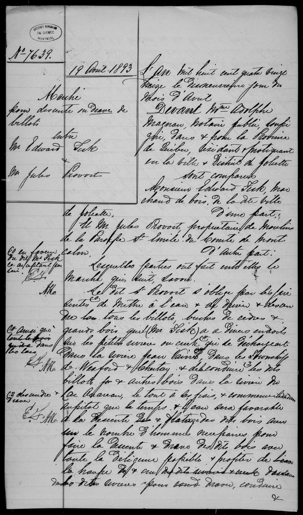Adolphe Magnan, 1850-1896, Archives nationales à Montréal, Fonds Cour supérieure. District judiciaire de Joliette. Greffes de notaires, (06M,CN605,S75).