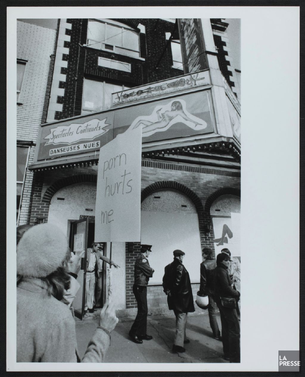 - Le dossier montre des manifestants devant des commerces affichant les services de travailleuses du sexe