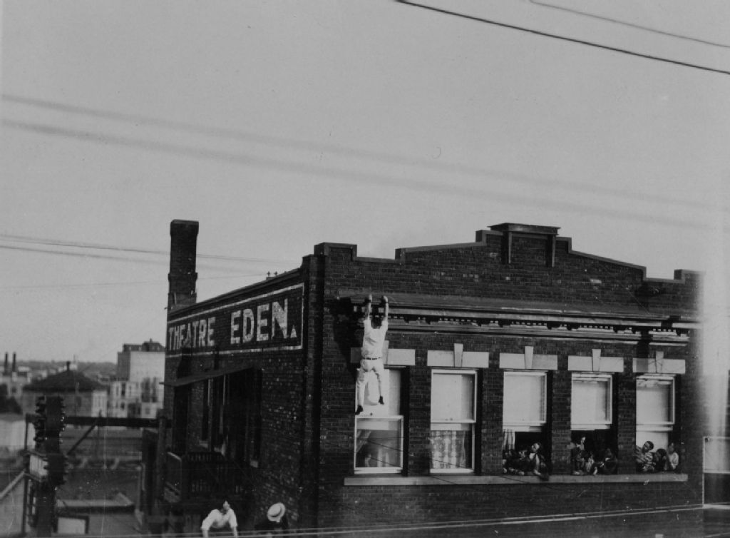 - Foule rassemblée pour voir l'acrobate "homme mouche" Jerry Hudson, s'agrippant aux murs de l'édifice Horner sur la rue Principale à Hull; "Théâtre Eden" inscrit sur le côté de l'édifice