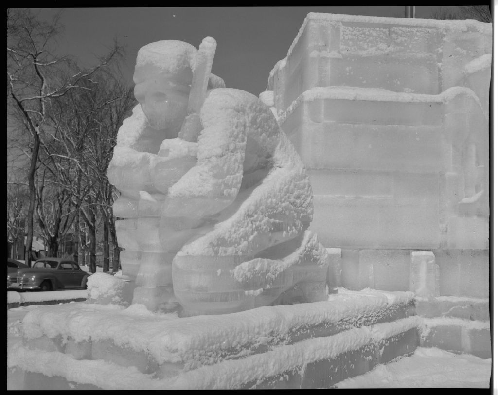 "Le trappeur" détail du monument de glace érigé au rond-point en face du Parlement lors du carnaval de Québec, 1955, Archives nationales à Québec, Fonds Ministère de la Culture et des Communications, (03Q,E6,S7,SS1,D2472,P273-55H), Neuville Bazin.