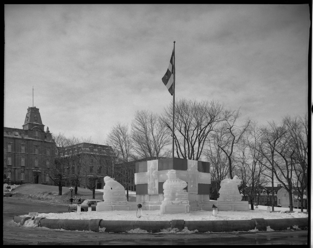 Vue d'ensemble du monument de glace sculpté en construit par la province au rond-point vis à vis l'entrée principale du Parlement
