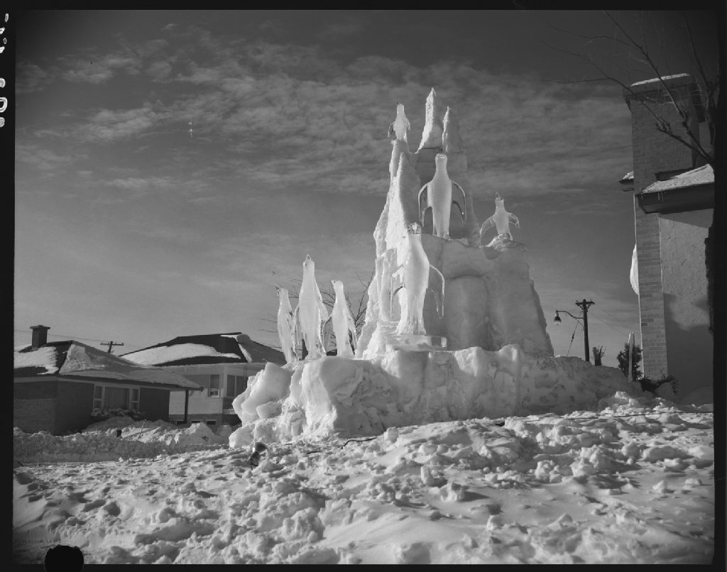 "Pingouins sur un iceberg" monument de glace sur la rue Saint-Cyrille, Québec, 1955, Archives nationales à Québec, Fonds Ministère de la Culture et des Communications, (03Q,E6,S7,SS1,D2472,P292-55H), Neuville Bazin.