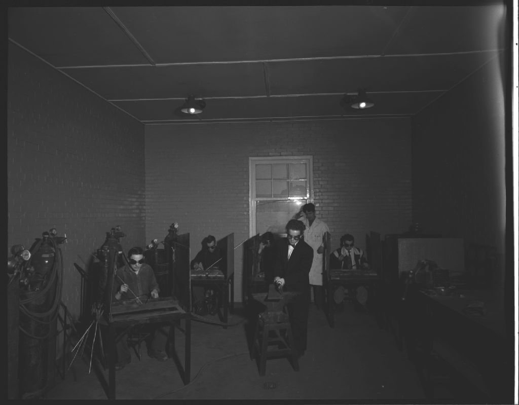 Atelier de soudure de l'École d'apprentissage en pêcheries à Grande-Rivière, 1955, Archives nationales à Québec, Fonds Ministère de la Culture et des Communications, (03Q,E6,S7,SS1,D2485,P446-55H), Gustave Bédard.