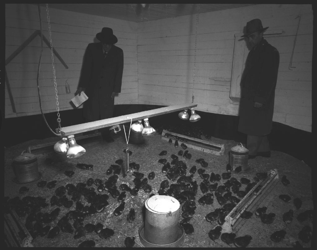 Éleveuse de poussins aux lampes infra-rouge à Saint-Pierre, Île d'Orléans